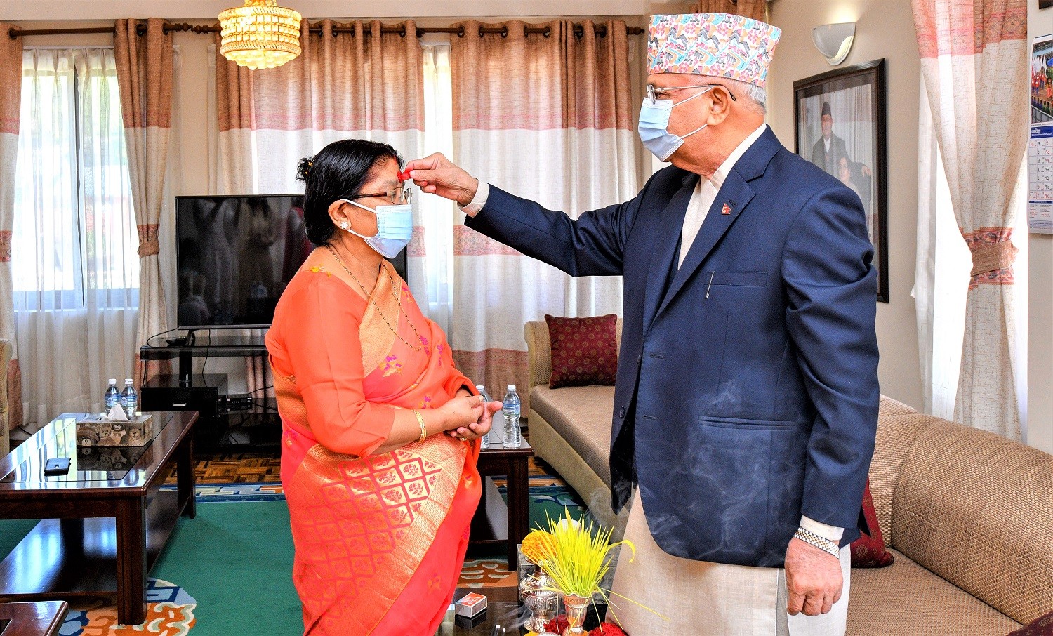 प्रधानमन्त्री ओलीसँगै उहाँकी पत्नी राधिका शाक्यले पनि राष्ट्रपतिबाट दसैँको टीका र जमराको माला लगाउनुभयो ।