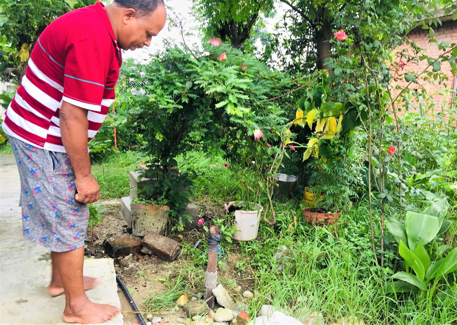 पानि सुकेको कलधाराको पाइप देखाउँदै गोकुलप्रसाद नेपाल ।अहिले उनीहरूले स्थानीय उपभोक्ता समितिमार्फत वितरीत पानी प्रयोग गरिरहेका छन् । आँगनकै डिलको धारा देखाउँदै नरबस्तीका राधा चौधरी भन्नुहुन्छ, ‘आफ्नै गाउँठाउँमा पनि पानी किनेर खान बाध्य छौँ ।’