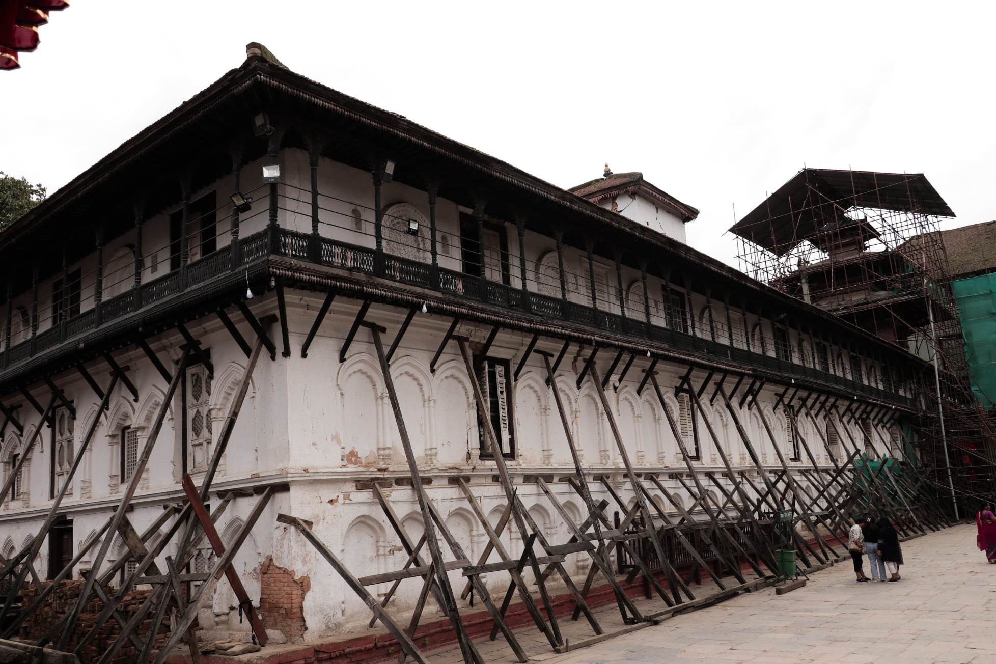 टेकोको भर कहिलेसम्म? हनुमानढाेका दरबार क्षेत्रमा भुकम्पले भत्काए पछि अझै टेकोको भरमा रहेकाे पुरातात्त्विक संरचना ।