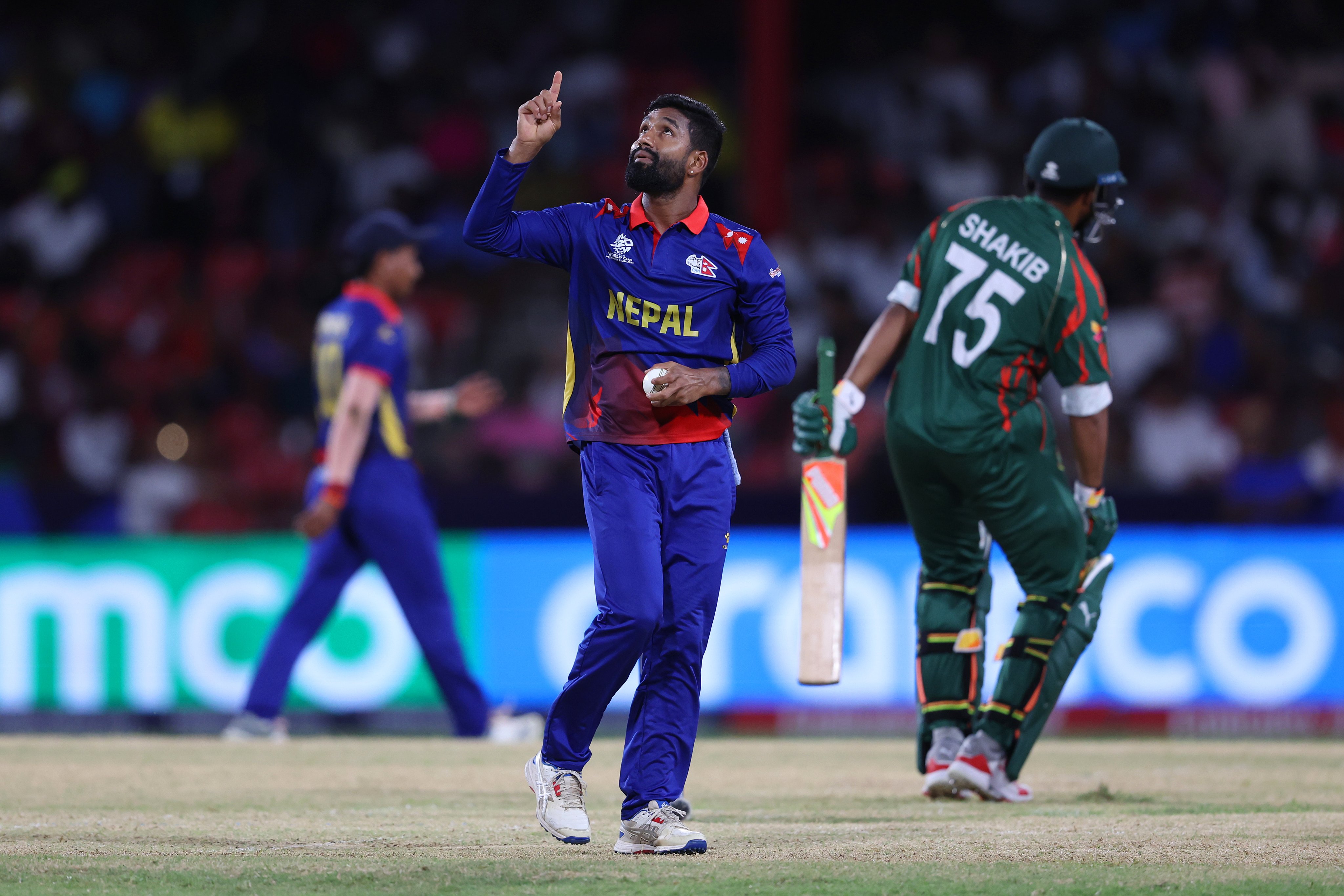 नेपालका लागि सोमपाल कामी, दीपेन्द्रसिंह ऐरी, रोहितकुमार पौडेल र सन्दीप लामिछानेले दुई दुई विकेट लिनुभयो ।